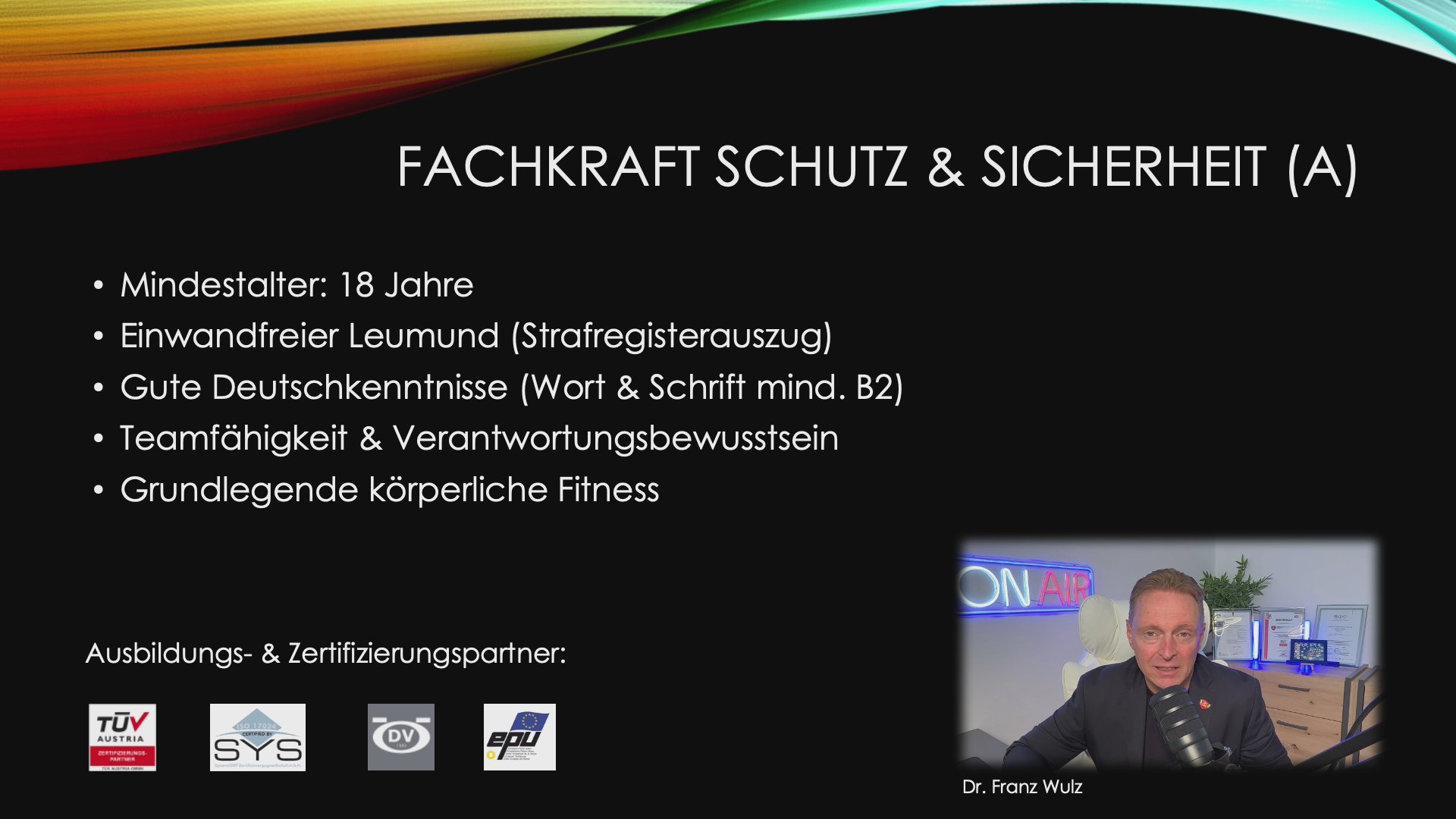Alternativ kannst du dich zur physischen TÜV-Zertifizierung mit Prüfungskommission anmelden. Nach bestehen dieser Abschlussprüfung durch den TÜV-Austria erhältst du den Berufstitel „Fachkraft für Schutz und Sicherheit in Österreich“ (personenbezogene Zertifizierung).